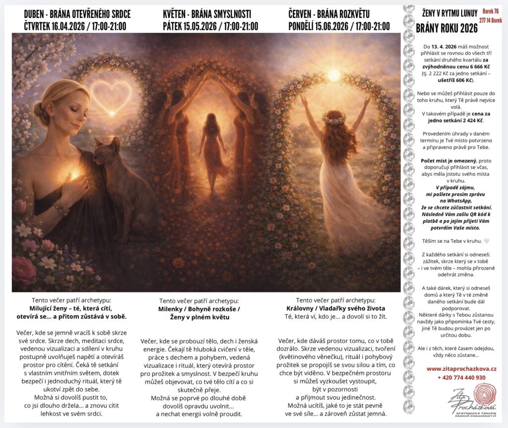 Ženské kruhy na Borku u Staré Boleslavi jsou měsíční setkání žen v bezpečném prostoru, vedené terapeutkou Zitou Procházkovou. Každé setkání má své téma, rituál a energetickou bránu podle novoluní. Níže najdete aktuální termíny.
