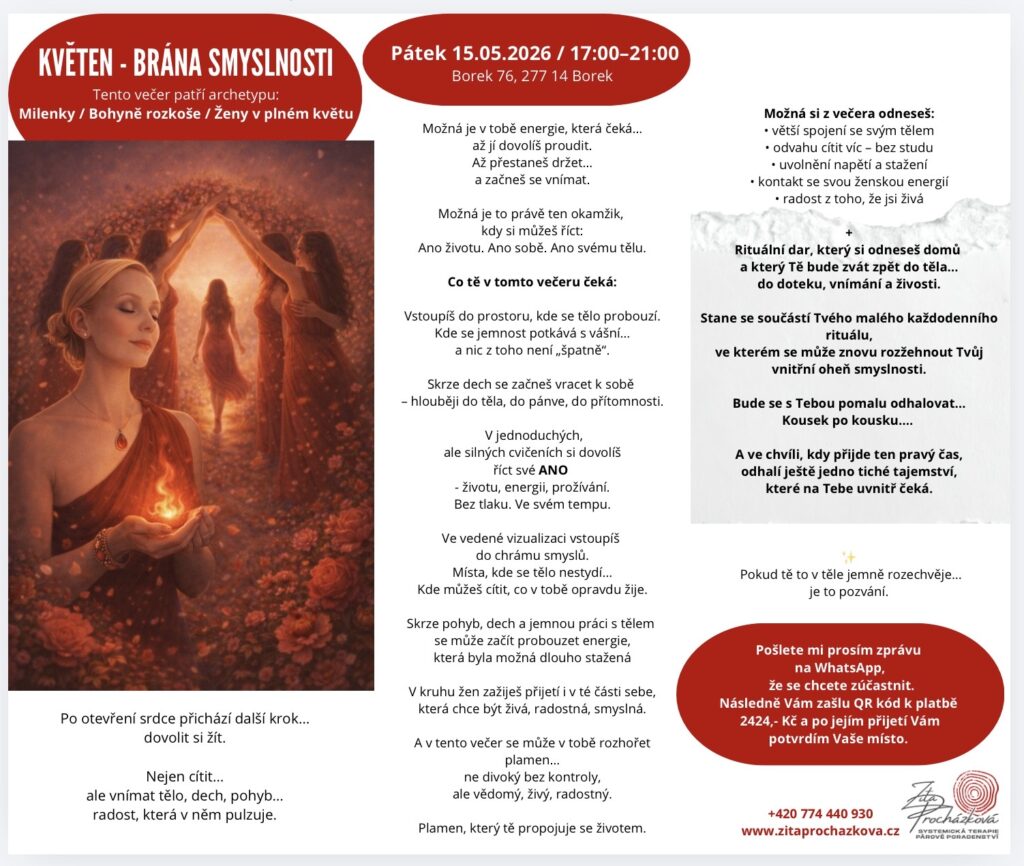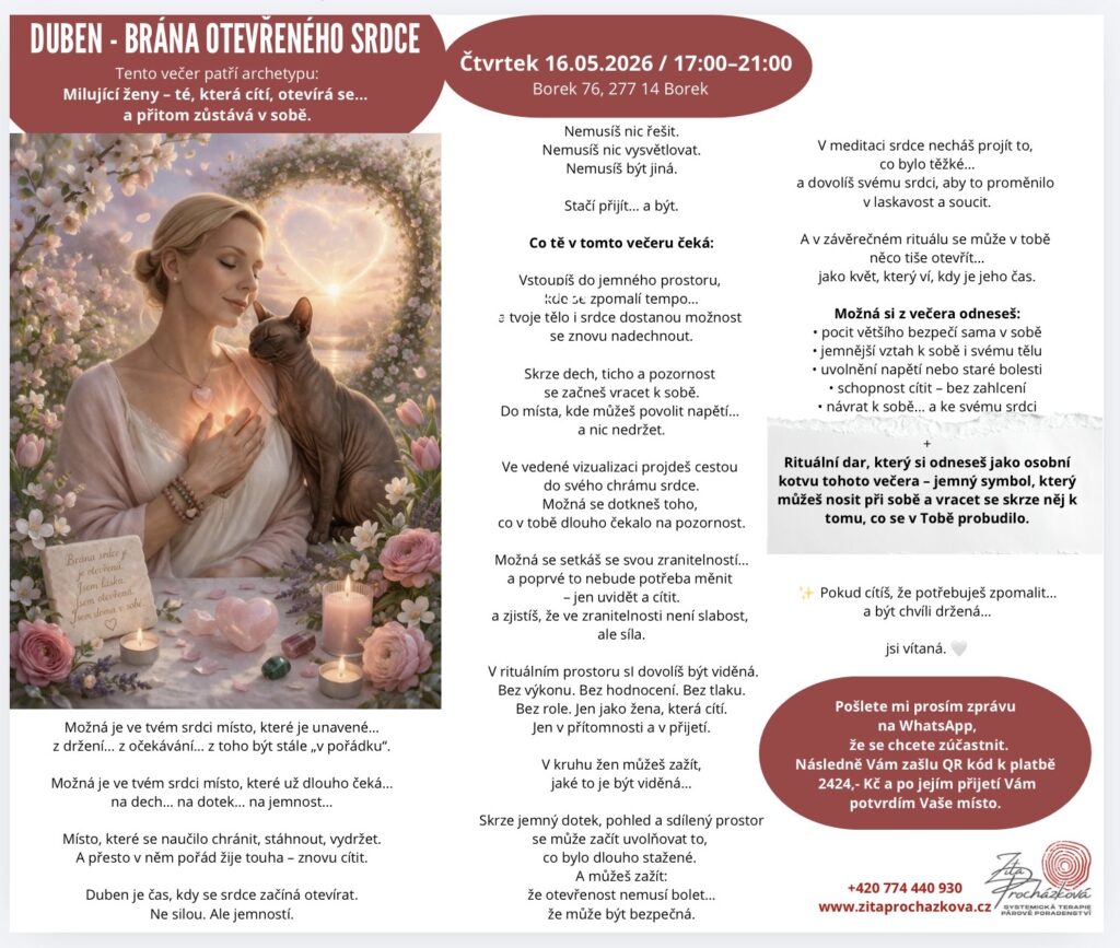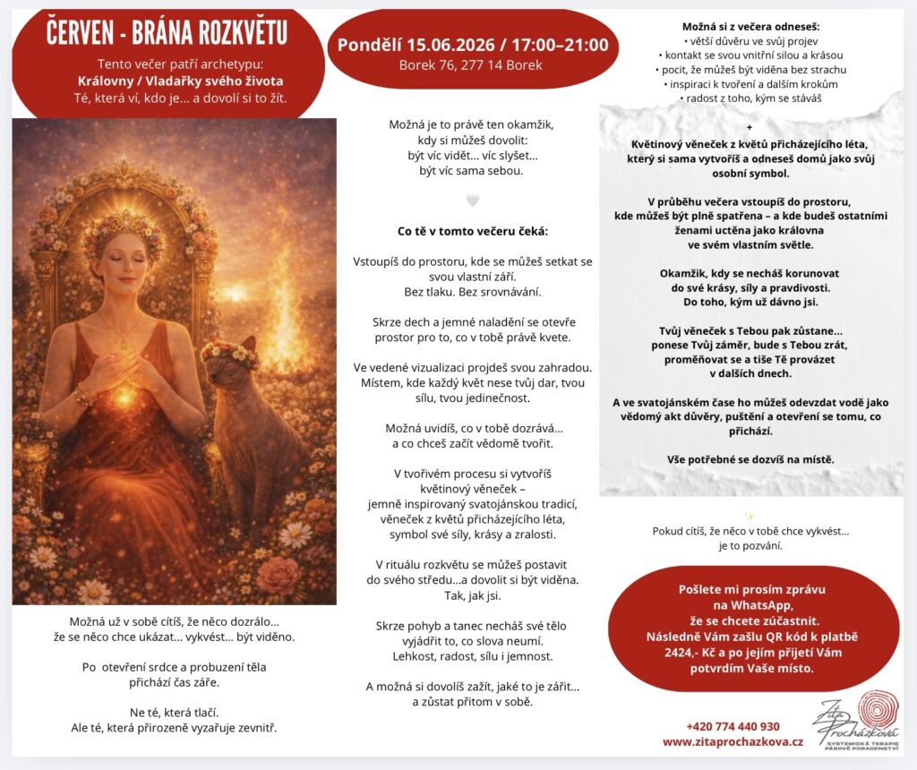 Společně budeme naslouchat své duši, sdílet v ženském kruhu, tančit, meditovat, konstelovat, tvořit a prožívat rituály, které nás povedou k větší vnitřní síle, jemnosti a přijetí.